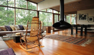 The interior design takes a different approach with a continuity of materials and finishes that tie the new and old together. Natural wood ceilings and flooring flow seamlessly from one end of the house to the other. The architect replaced the original fireplace with a suspended rotating fireplace that captures the spirit of midcentury modern design.